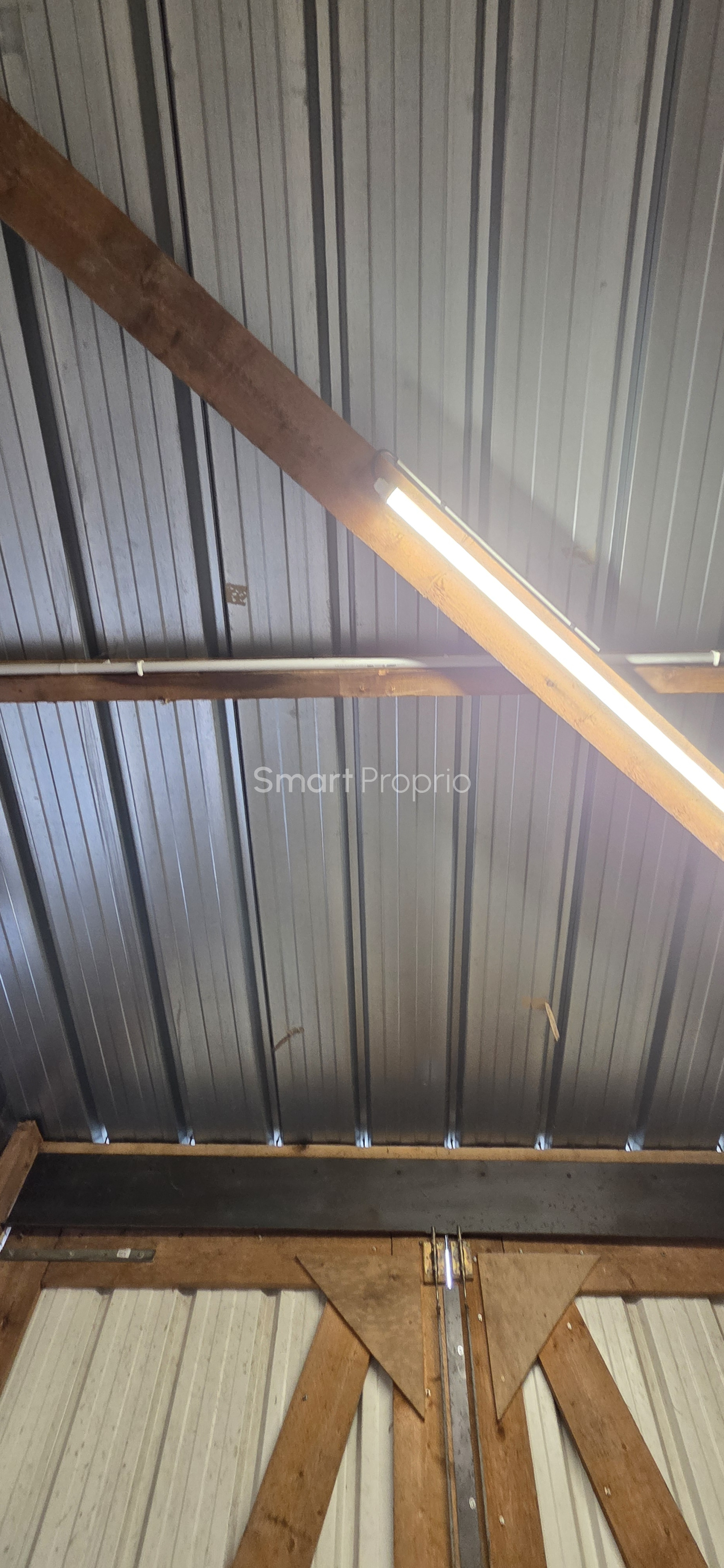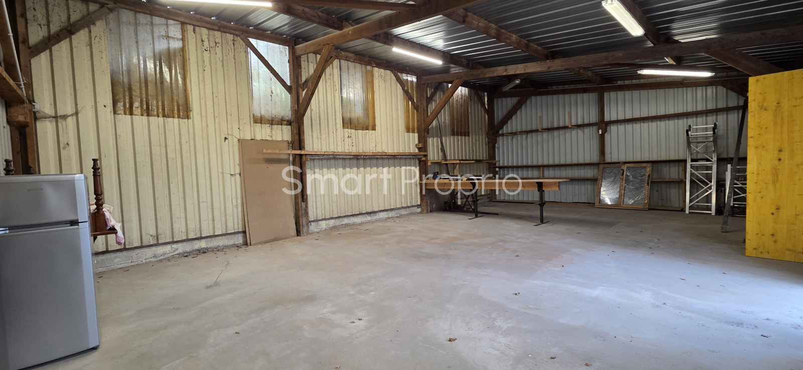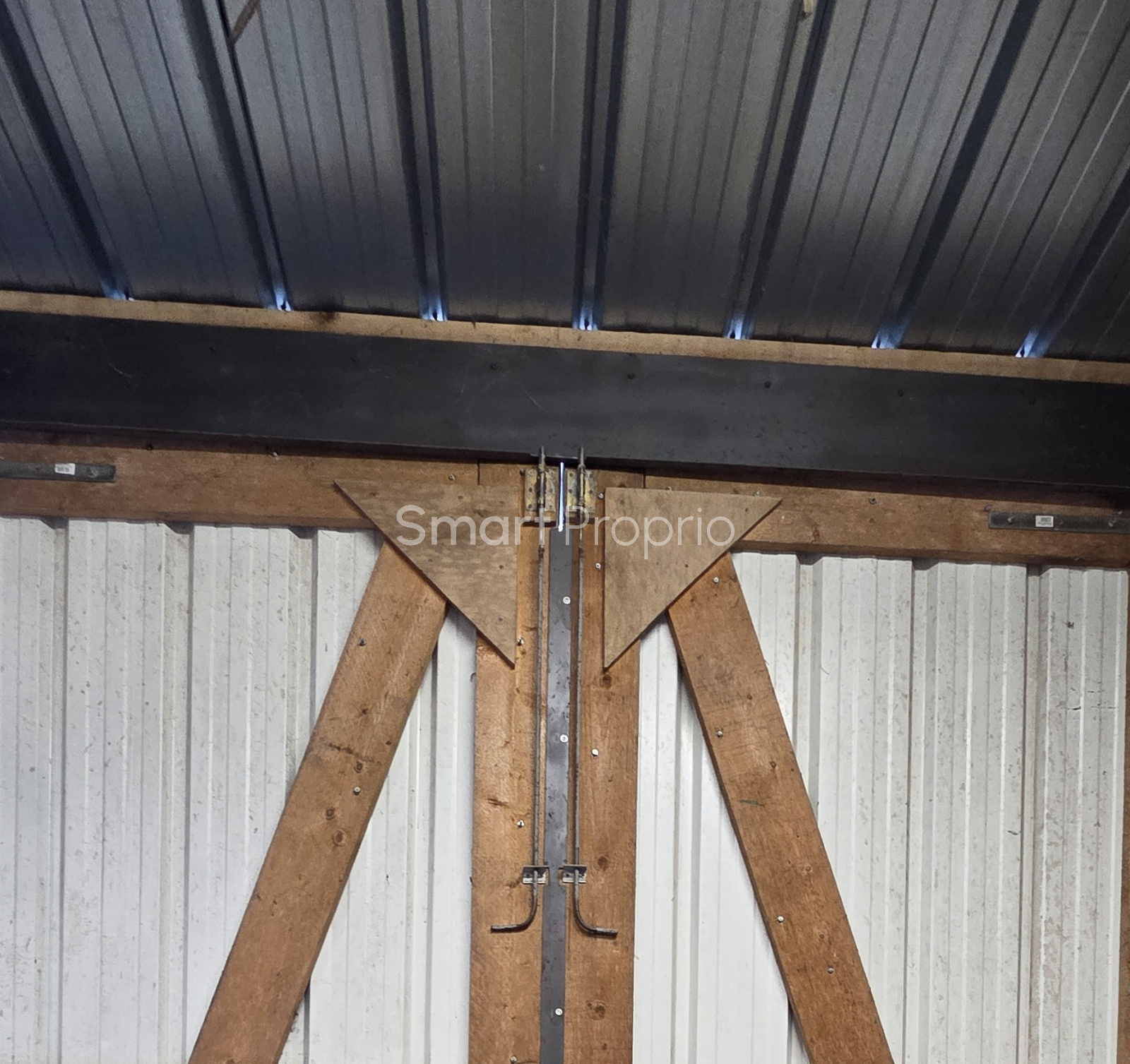 Le bâtiment, en structure bois avec bardage métallique et couverture en tôle, se compose d'un grand espace de plain-pied sur dalle béton, équipé de trois portes sectionnelles (hauteur permettant l'entrée de véhicules utilitaires), d'un éclairage néon, d'une alimentation électrique, d'un point d'eau et d'une installation d'alarme. Hauteur sous poutres permettant le rangement ou le travail artisanal courant.