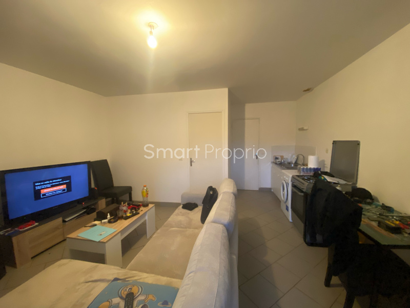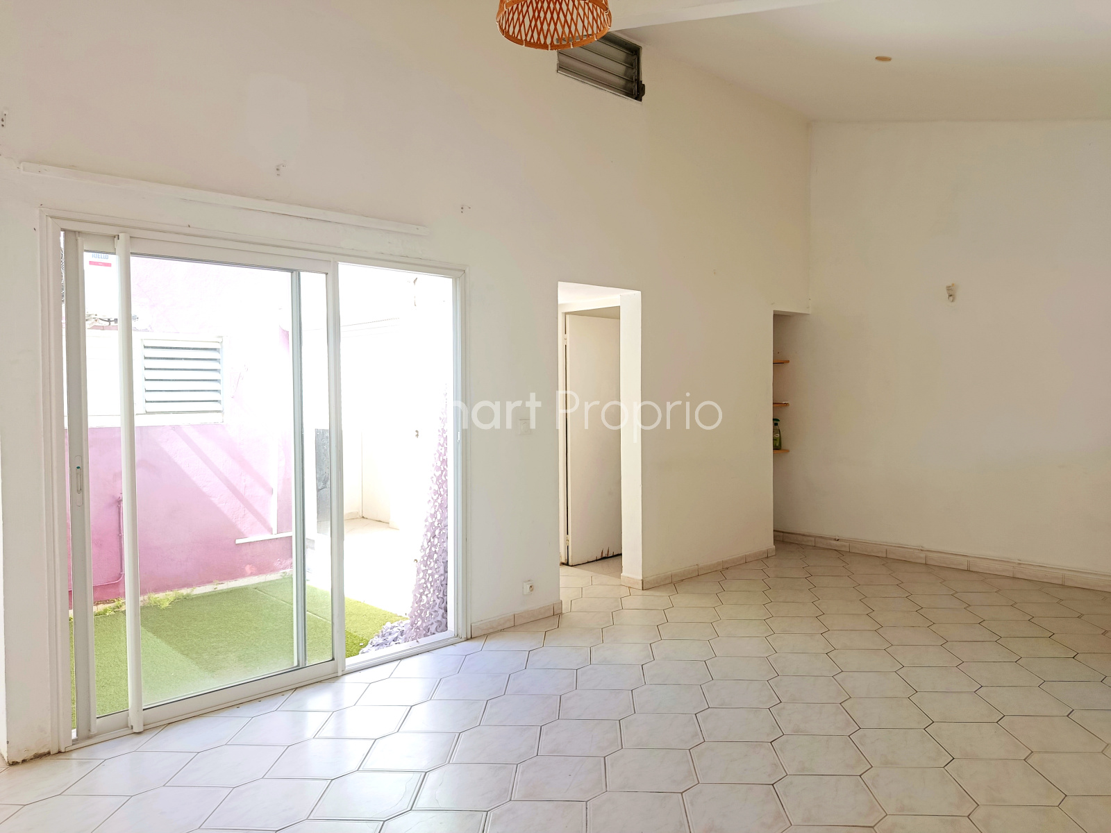 Maison d'environ 90m², composée d'une cuisine aménagée semi-ouverte sur une pièce de vie lumineuse, et un patio intérieur.