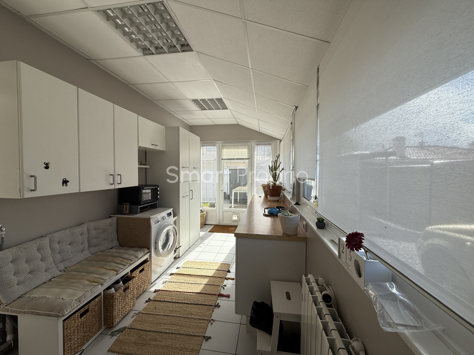 Une verranda lumineuse aménagée en buanderie est communiquant avec le garage donne l'accés à la maison.