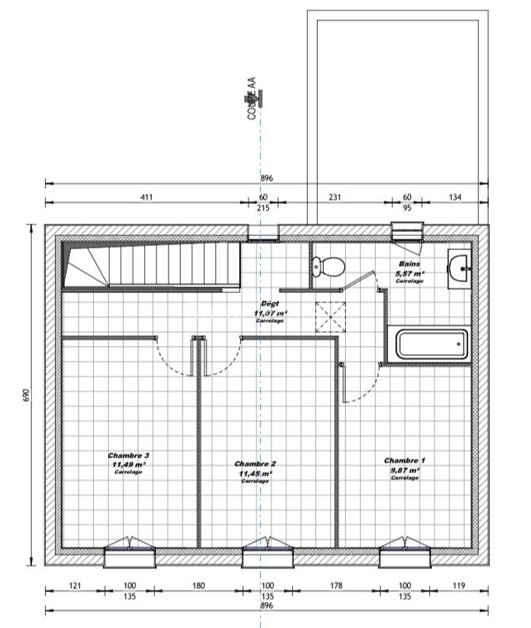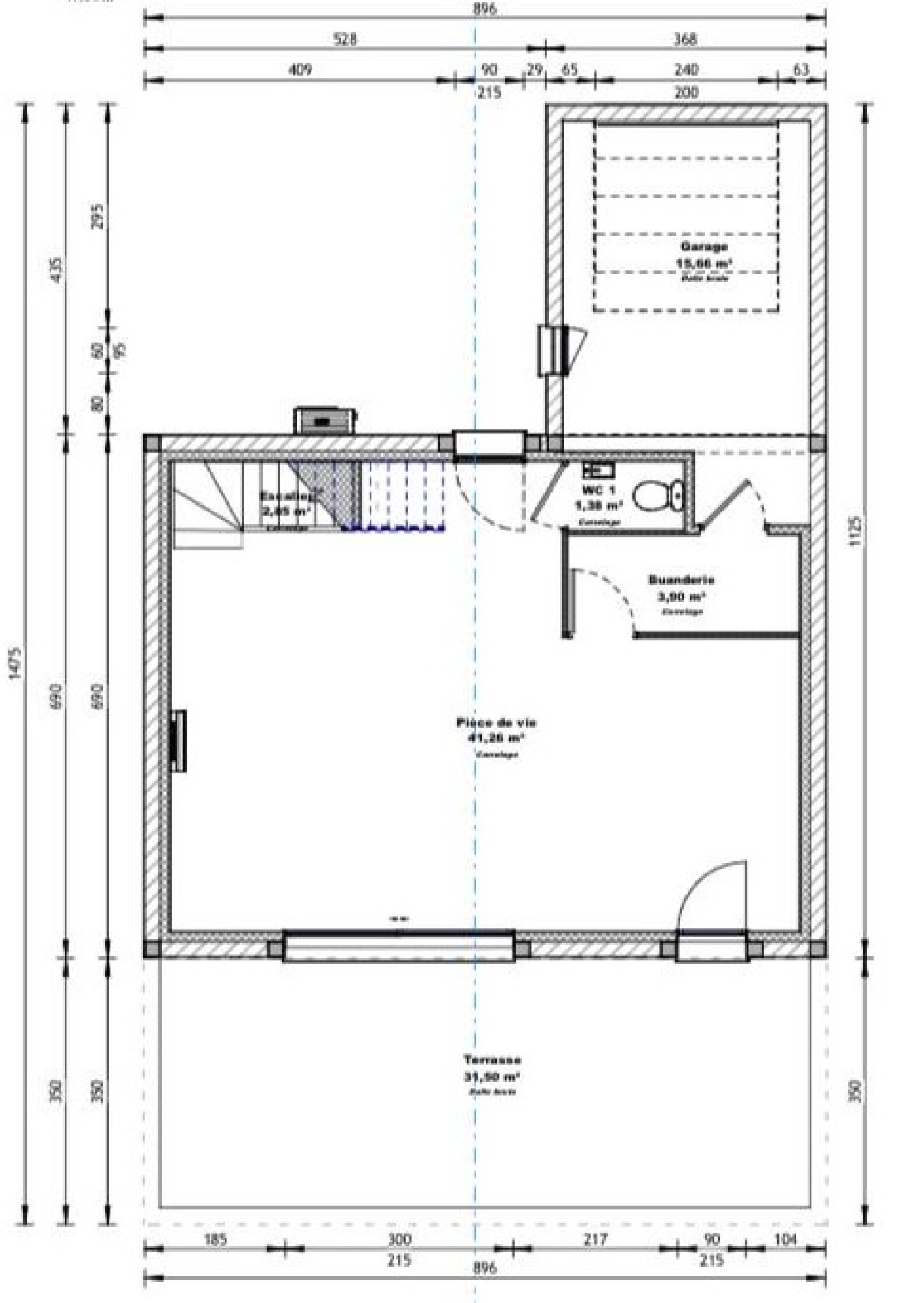 Le rez-de-chaussée est composé d'une pièce à vivre de 41 m² lumineuse et fonctionnelle, la cuisine équipée s'intègre parfaitement dans cet espace de vie donnant sur une grande terrasse de 31 m² ; la buanderie/cellier, le wc indépendant et le garage (16 m²) complètent ce niveau. L'étage abrite la partie nuit, un dégagement de 11 m² dessert trois chambres de 10 à 12 m² avec placard, une salle de bain avec toilette.