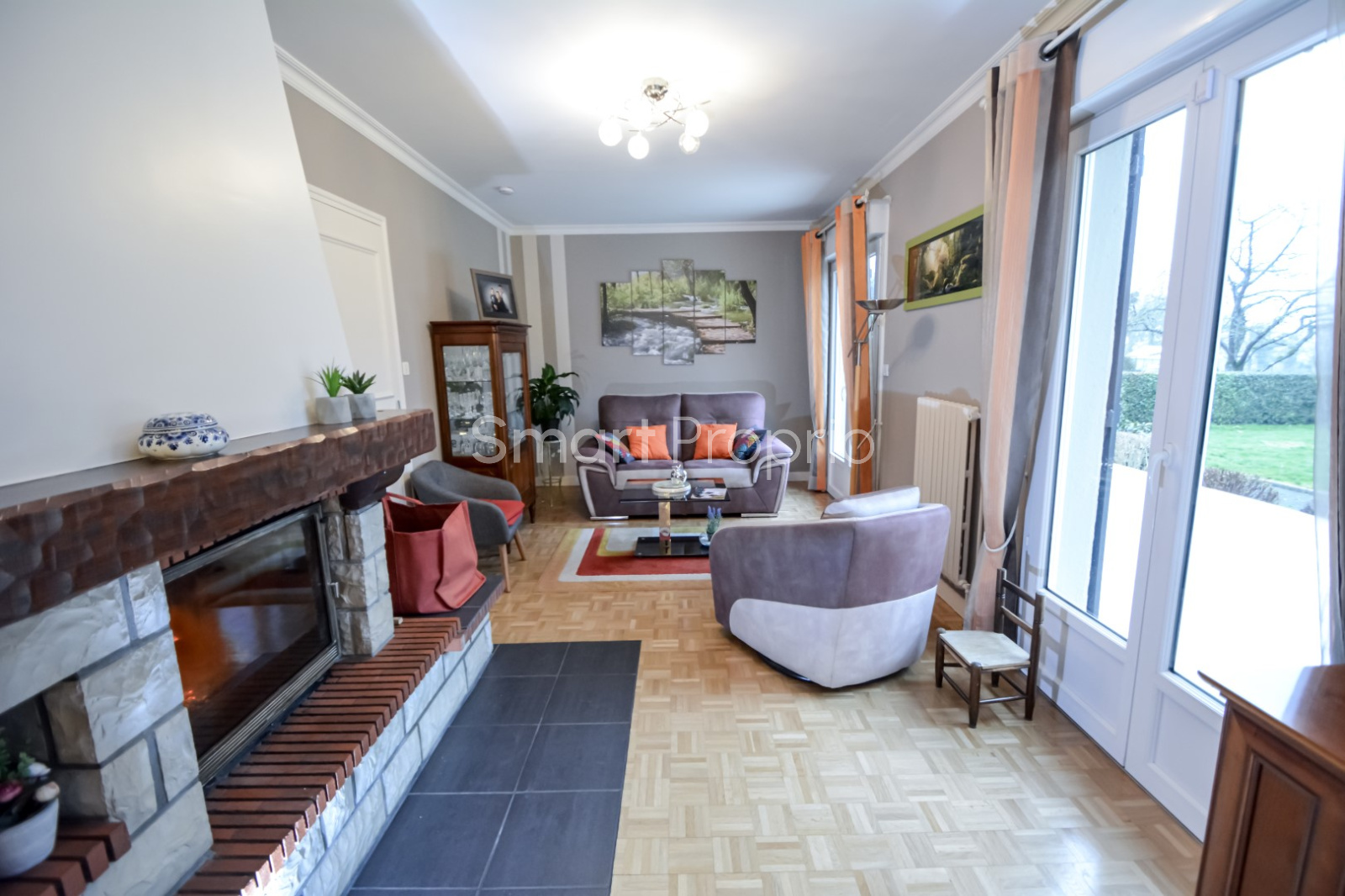 Elle se compose au RDC d'une cuisine de 11m², de deux chambres, d'une salle d'eau, d'un WC indépendant, et d'un espace salon-salle à manger d'environs 38m² équipé d'une cheminée avec Insert à récupérateur de chaleur.