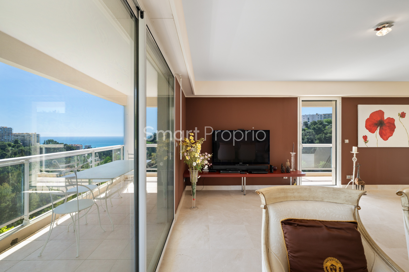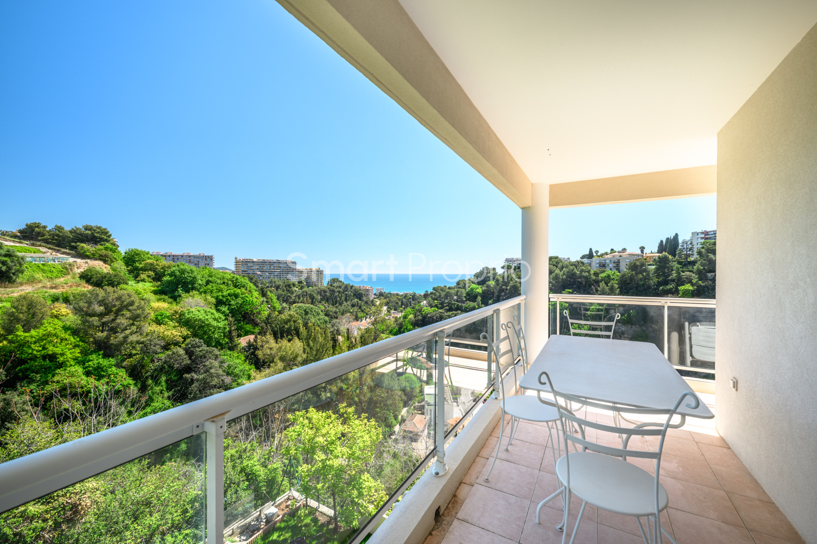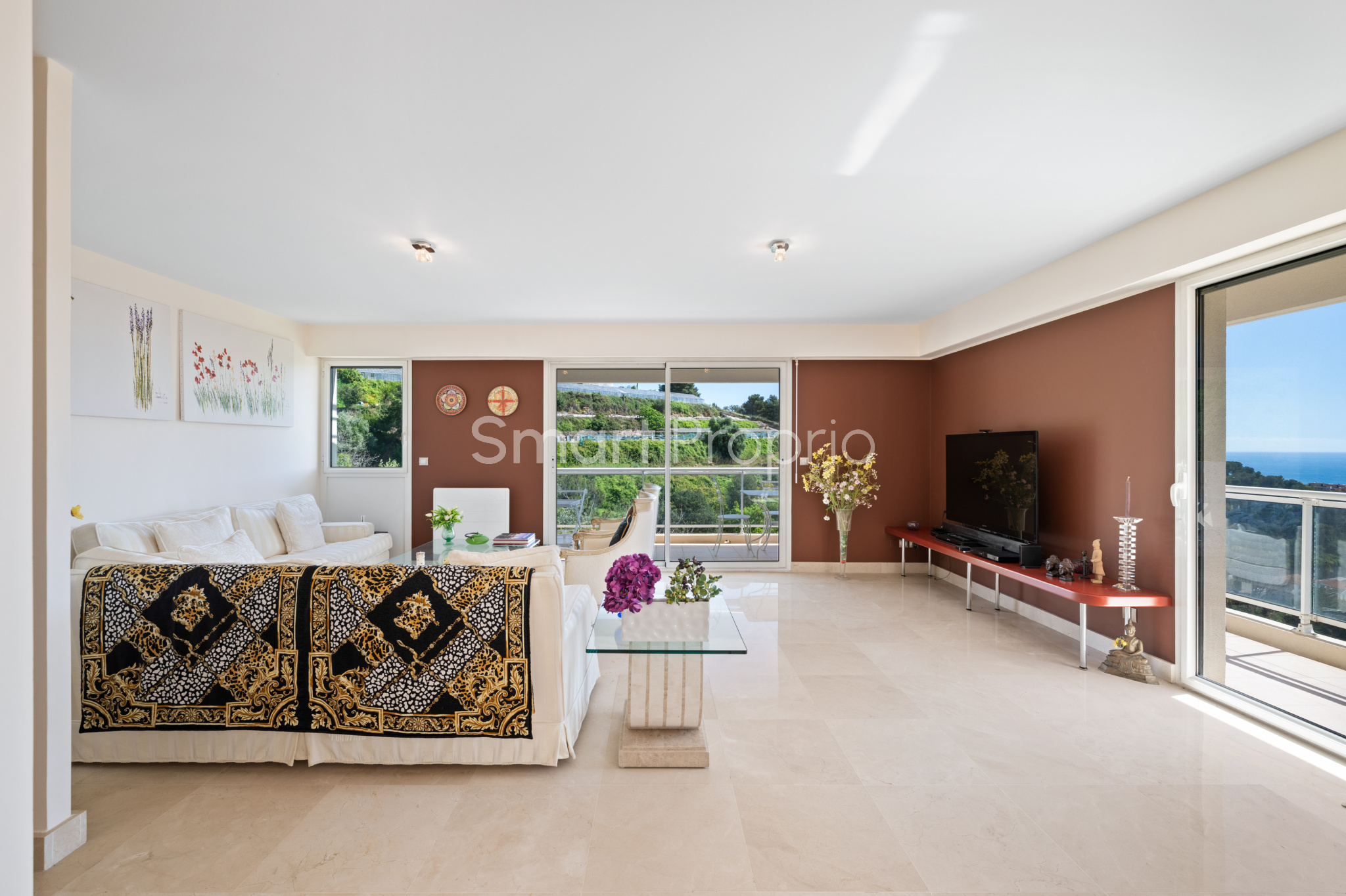 Ses multiples terrasses, dont une principale exposée plein Sud avec vue mer et collines, invitent à profiter pleinement de la luminosité, de la vue et du cadre.