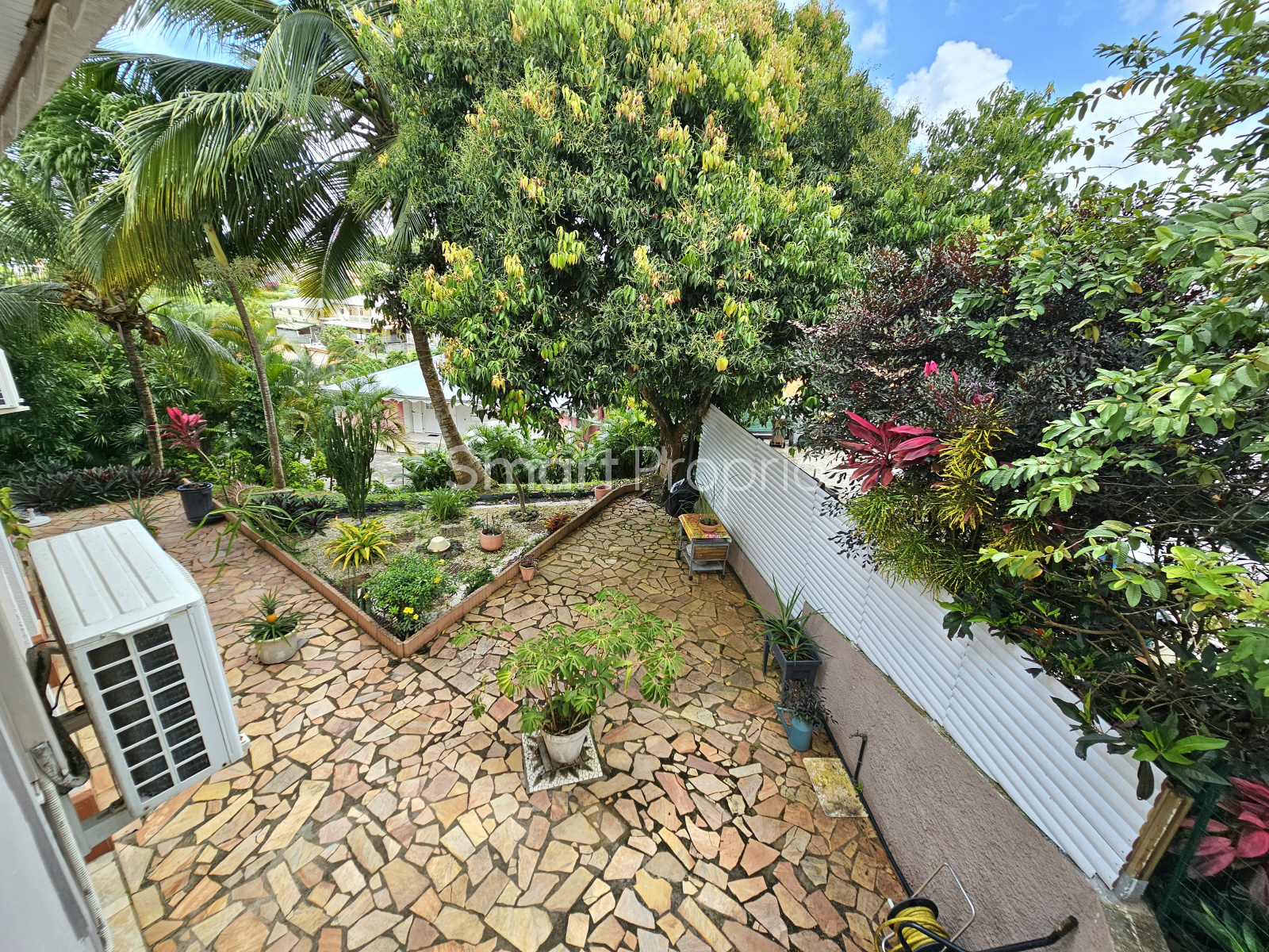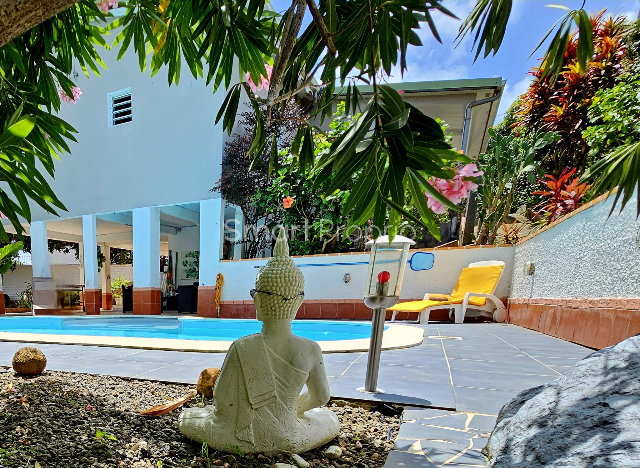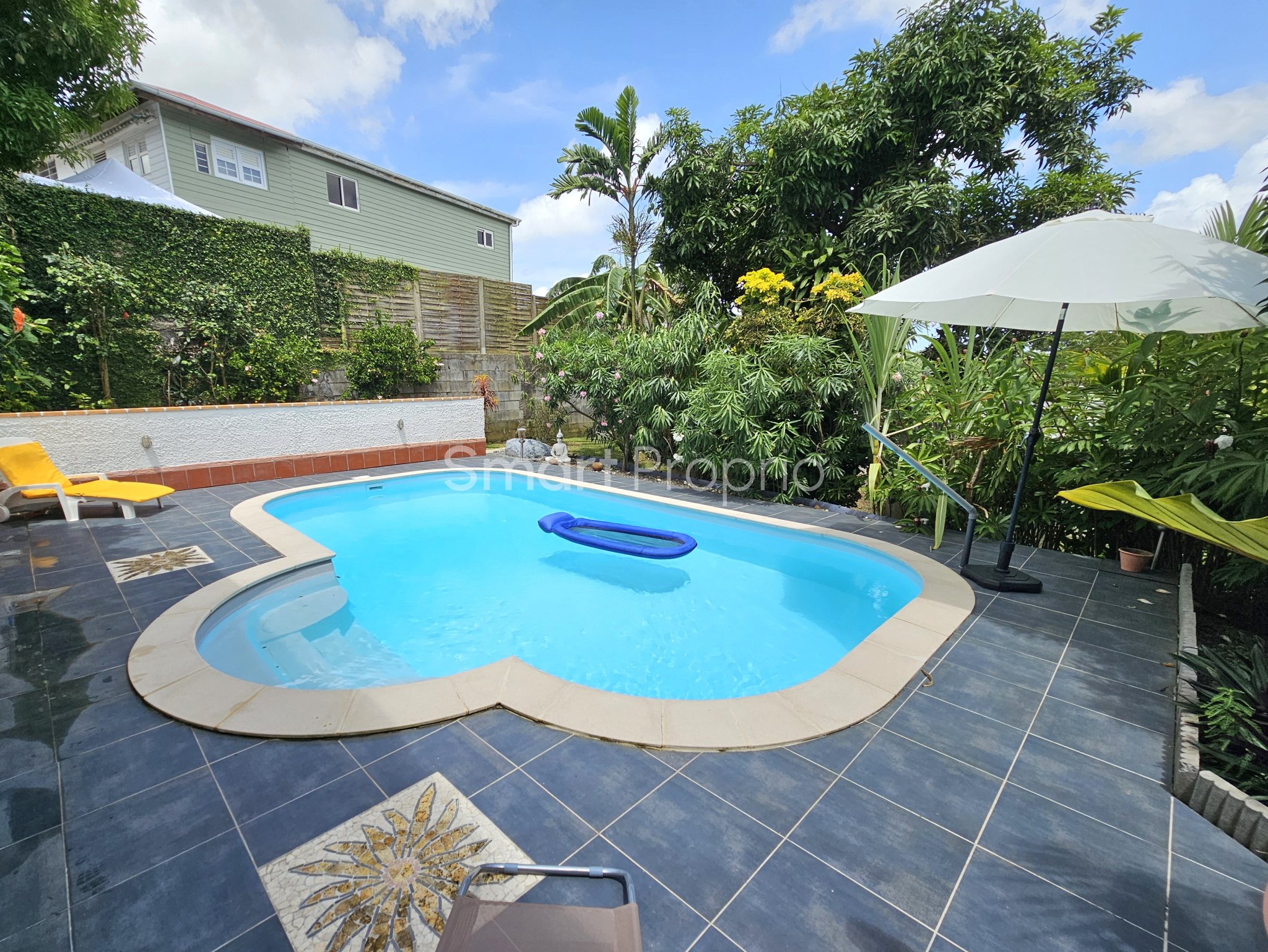 À l’extérieur, le cadre est tout aussi séduisant : piscine chauffée (8 × 4 m), jardin arboré (manguiers, cocotiers, citronniers), deux citernes d’eau de 2 500 L et chauffe-eau solaire.