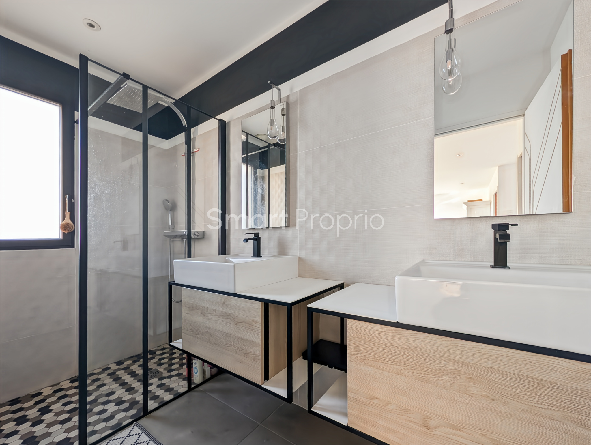 À l’étage, un palier à usage de bureau dessert deux chambres ouvrant sur une belle terrasse d’environ 28 m², une salle d’eau et des toilettes.