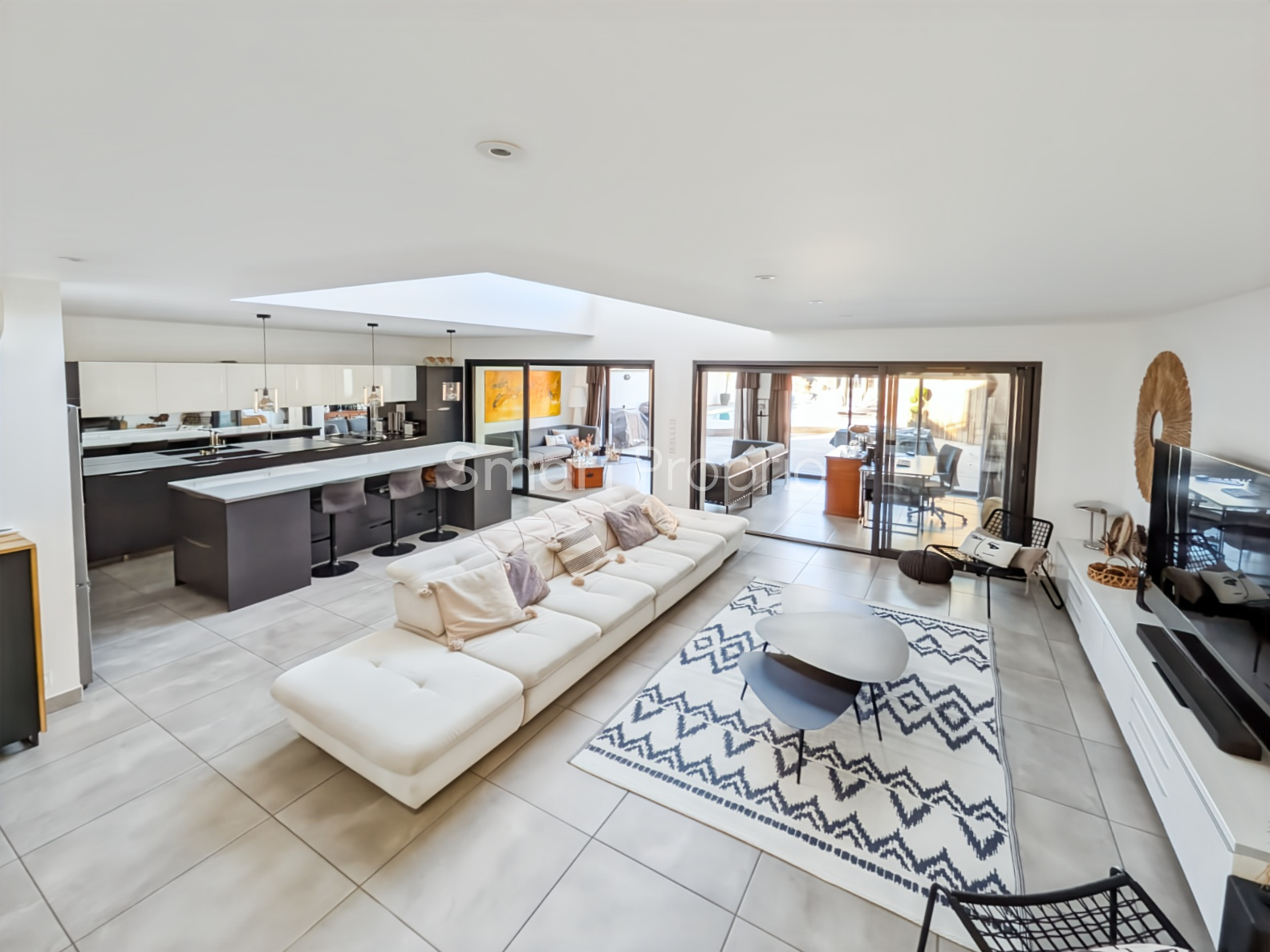 La maison s’organise autour d’une vaste pièce de vie aux volumes remarquables, comprenant un séjour avec cuisine ouverte et une extension bureau, totalisant plus de 80 m². La hauteur sous plafond cathédrale et les baies vitrées offrent une luminosité exceptionnelle et une continuité naturelle vers les terrasses et le jardin.