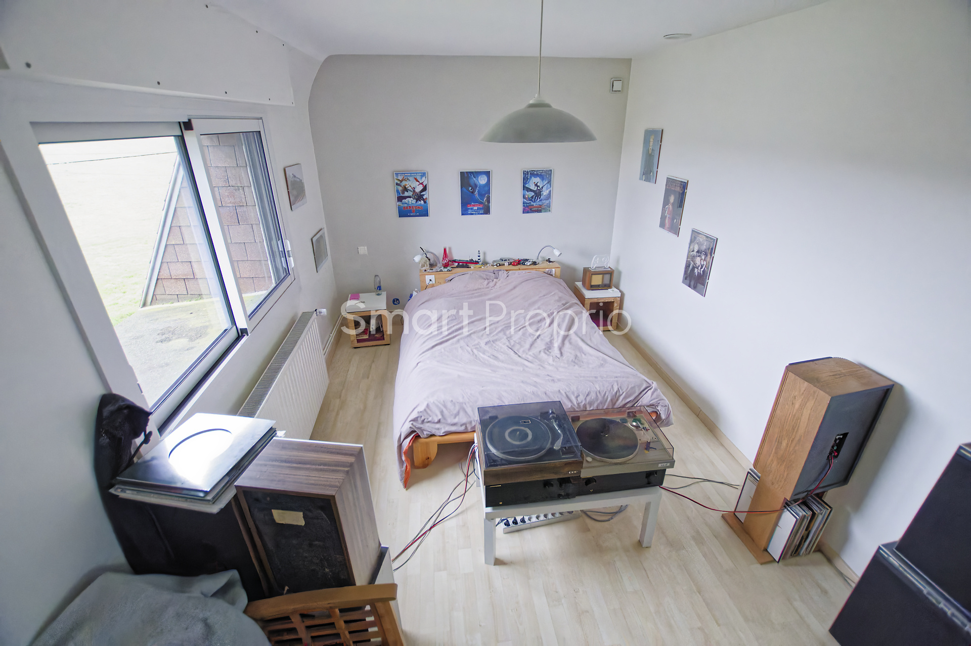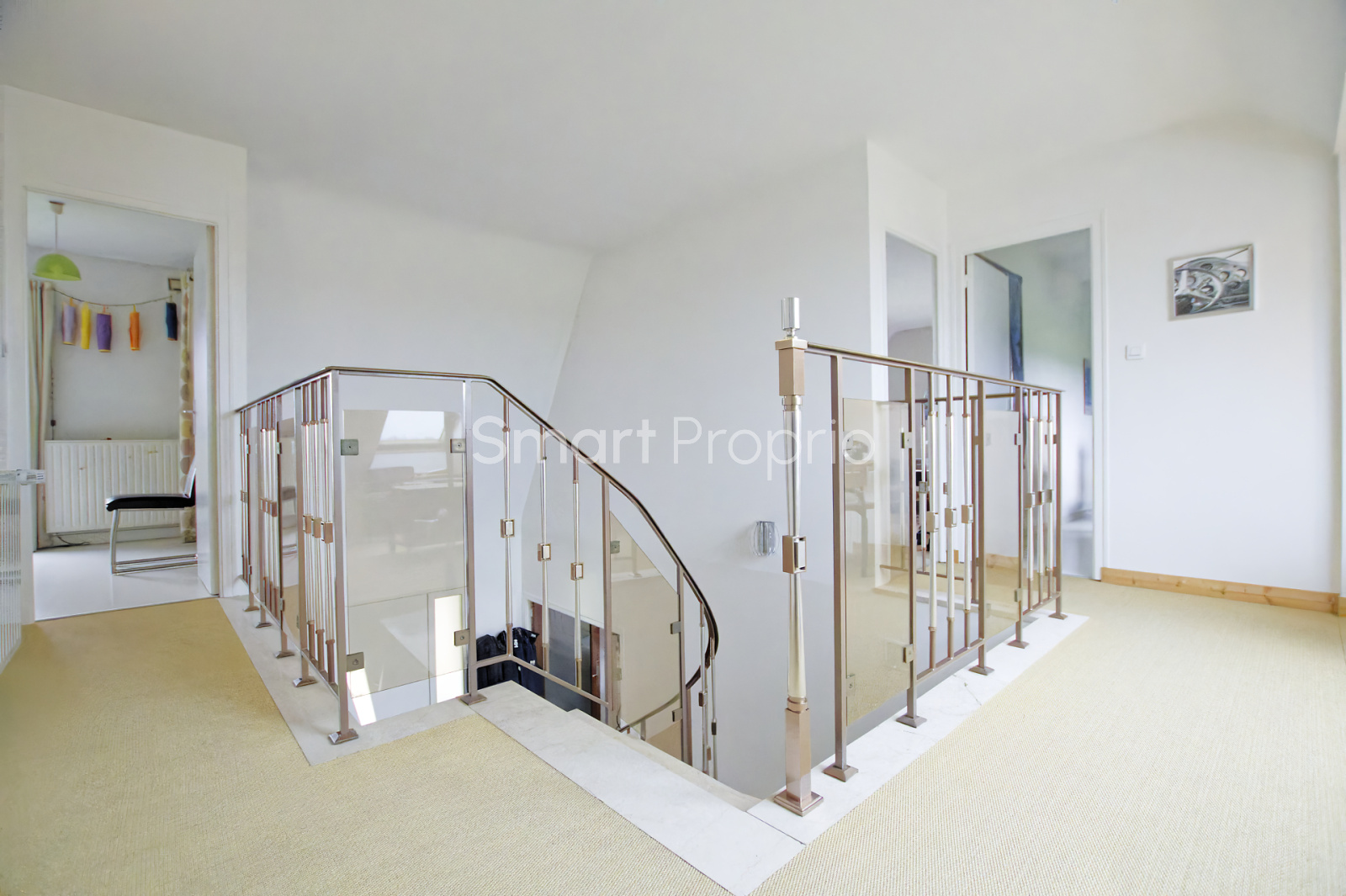 À l'étage, cinq chambres accueillent chacun selon ses envies. Les enfants ont leur espace, les parents aussi. Une salle de bains, une salle d'eau et deux WC séparés pour que les matins se passent sans embouteillages. Une buanderie dédiée pour que le quotidien reste fluide.