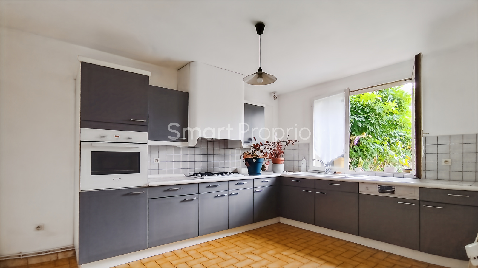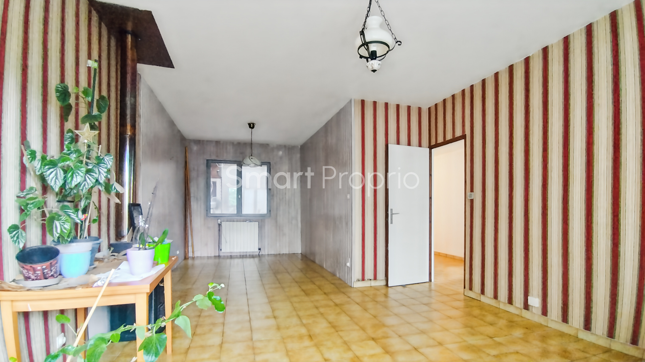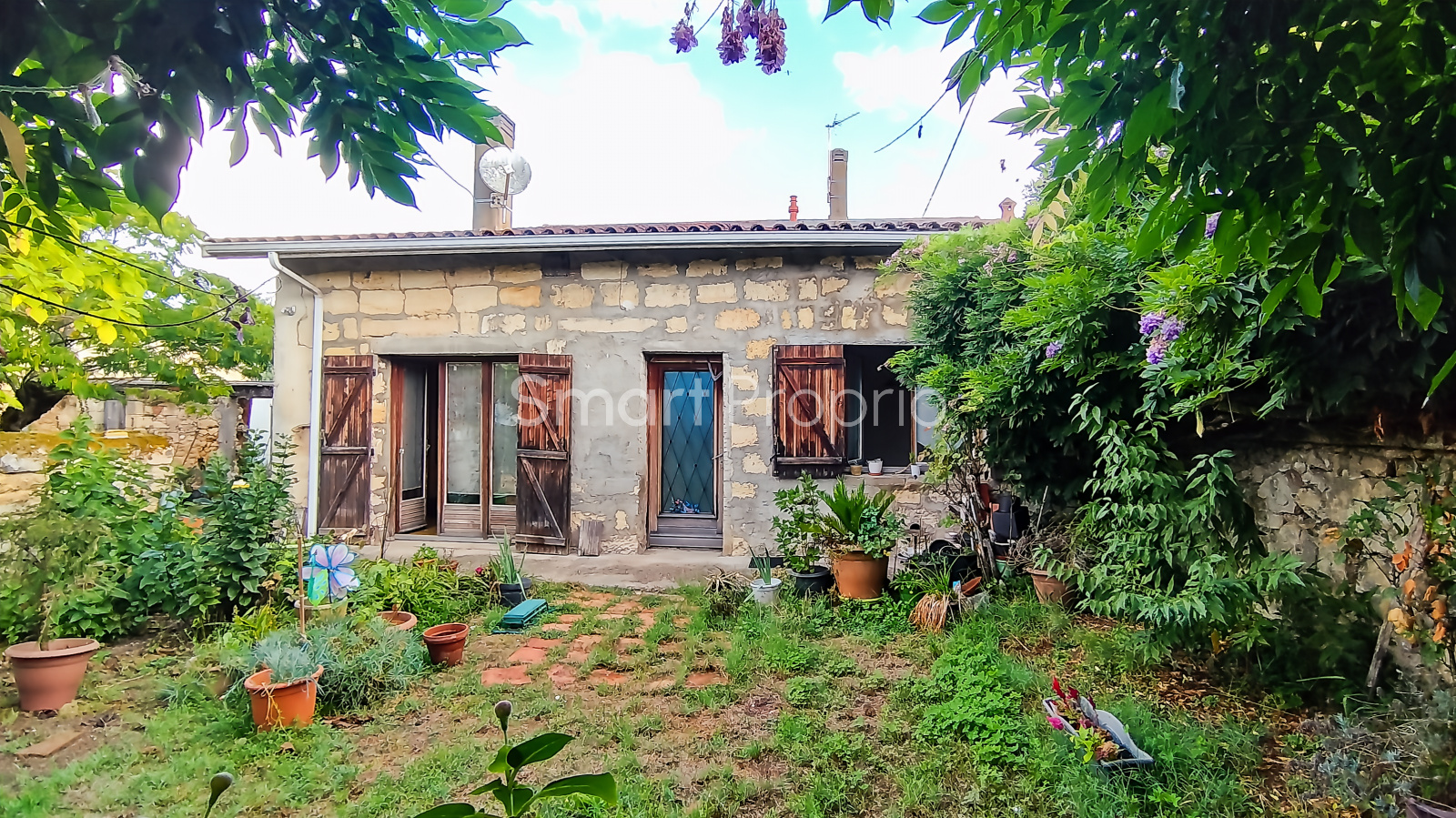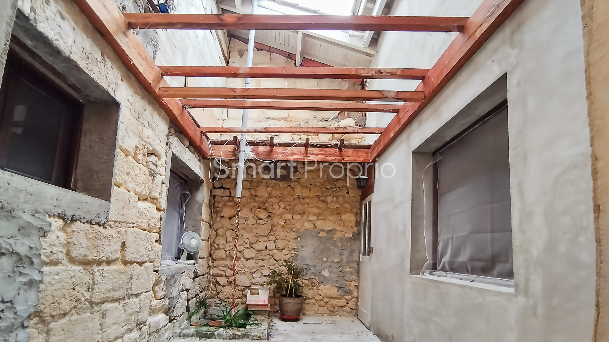 La maison principale, à rénover, de 98,3 m² de plain-pied, se trouve sur deux parcelles avec combles aménageables. Elle dispose de trois chambres, d’une cour intérieure, d’une cuisine équipée, du chauffage au gaz (chaudière à condensation récente) et de fenêtres en survitrage.