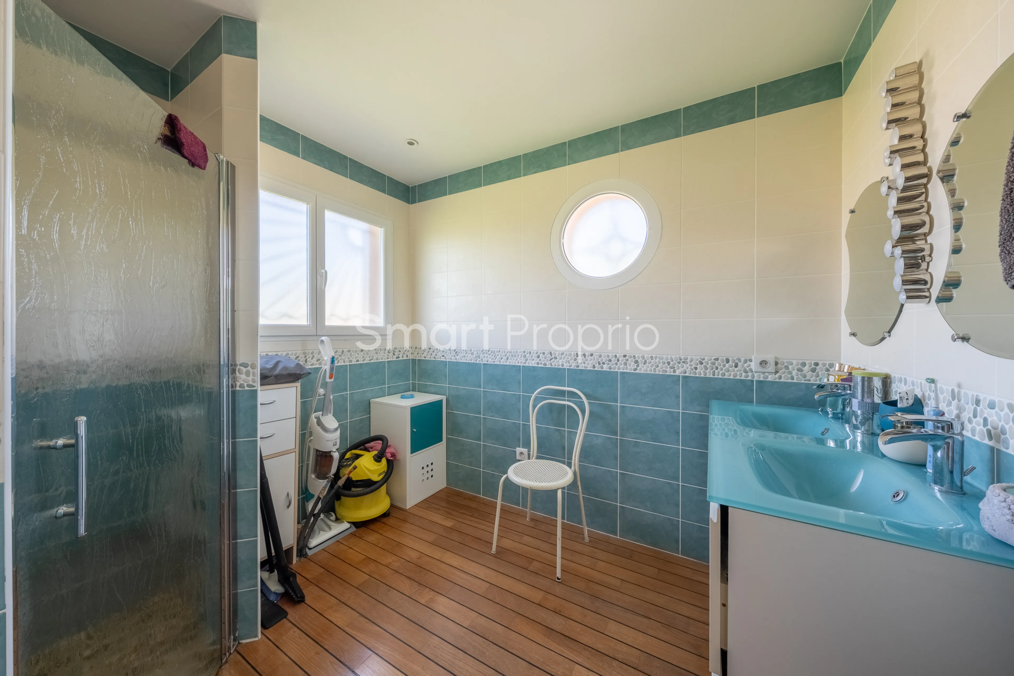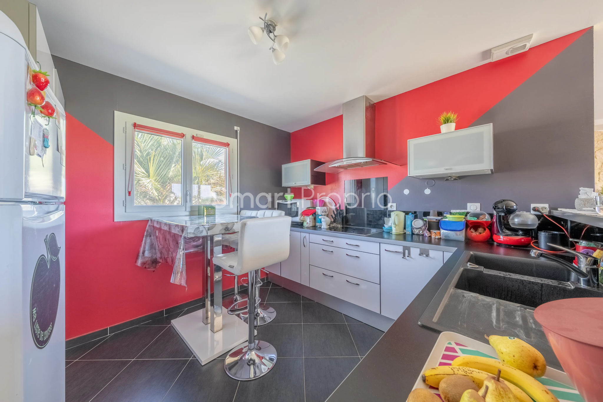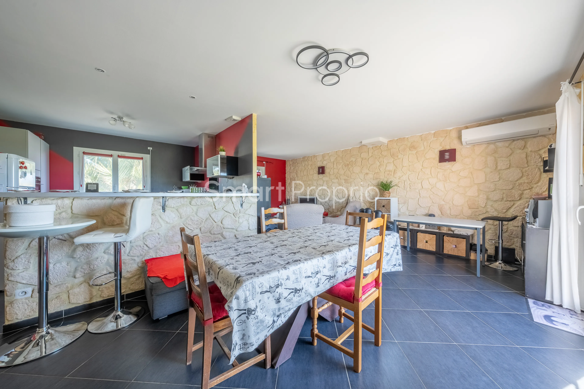 À l’intérieur, la maison offre une entrée ouvrant sur une belle pièce de vie lumineuse avec salon, salle à manger et cuisine ouverte avec cellier attenant. Cet espace convivial est équipé d’une climatisation réversible et donne directement accès à la terrasse. Côté nuit, vous trouverez trois chambres, une salle de bain et un WC indépendant.