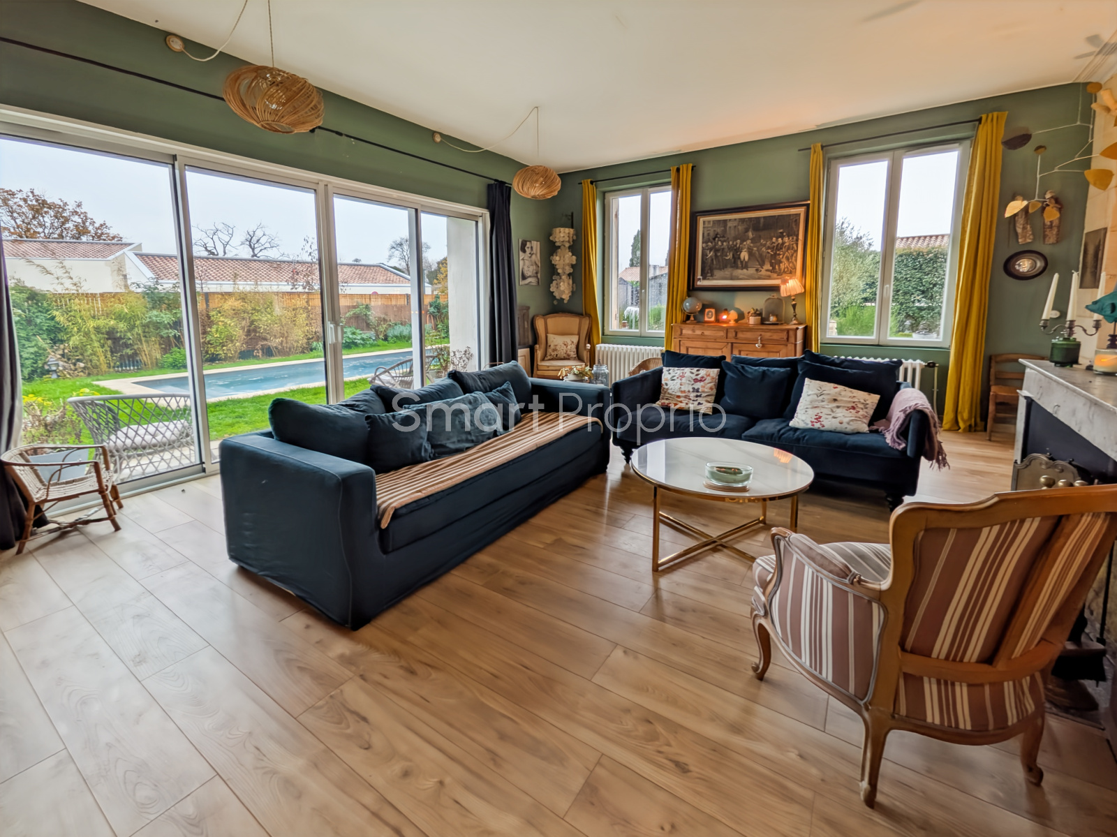 Immense baie vitrée à galandage offrant une ouverture totale sur le jardin et la piscine.