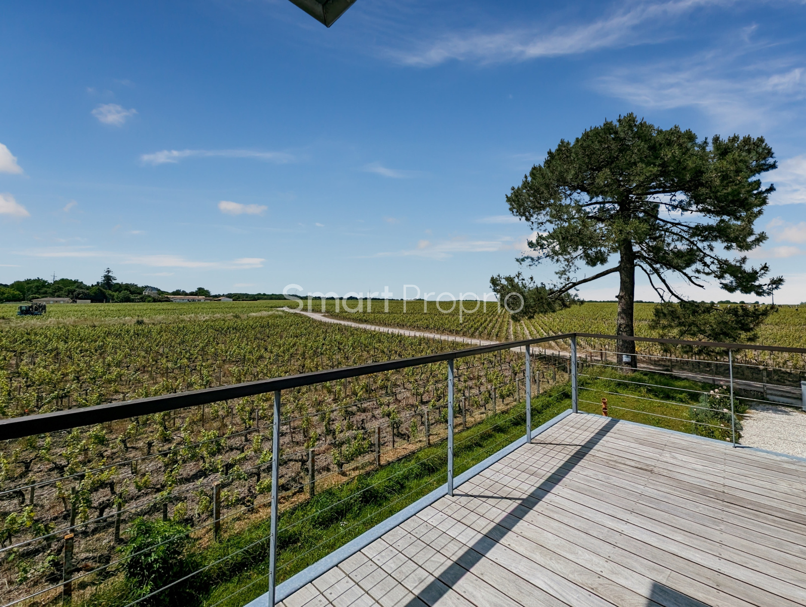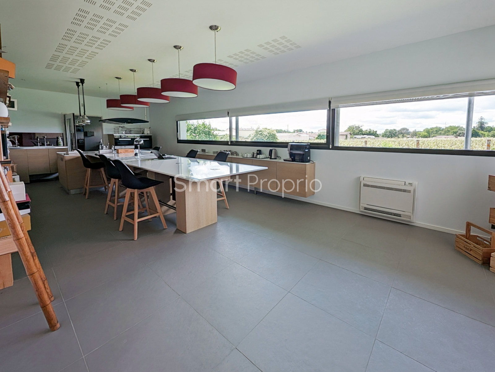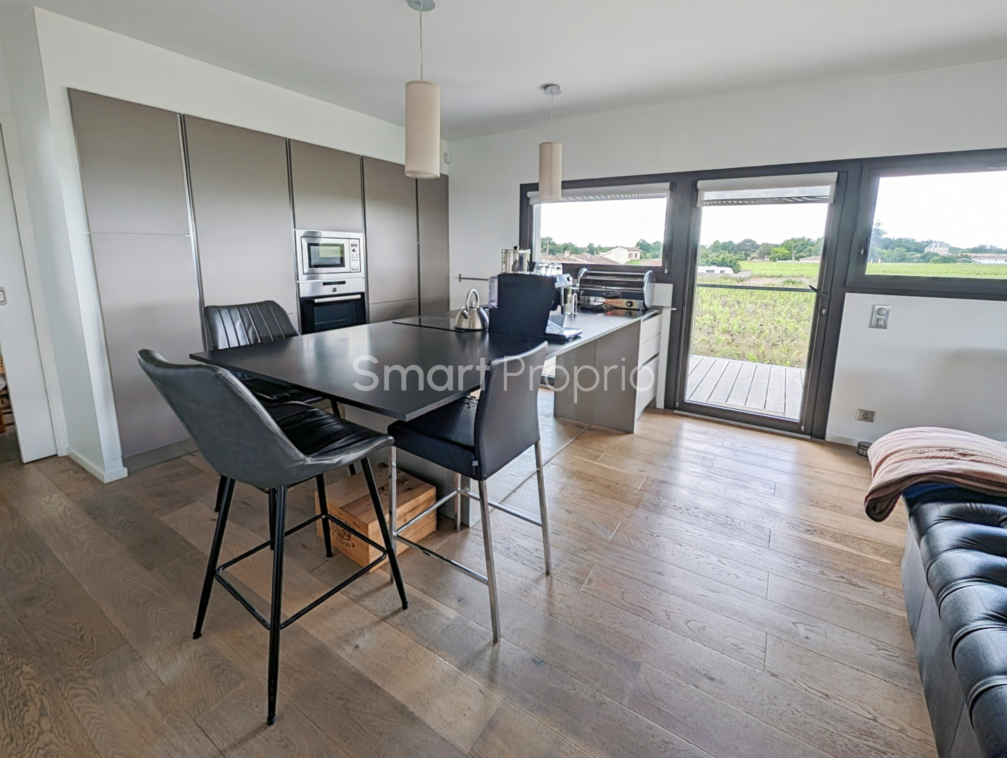 À l’étage, une grande pièce de vie lumineuse de type loft avec cuisine ouverte et îlot central, offrant une vue panoramique sur les vignes et un accès à une immense terrasse en bois.