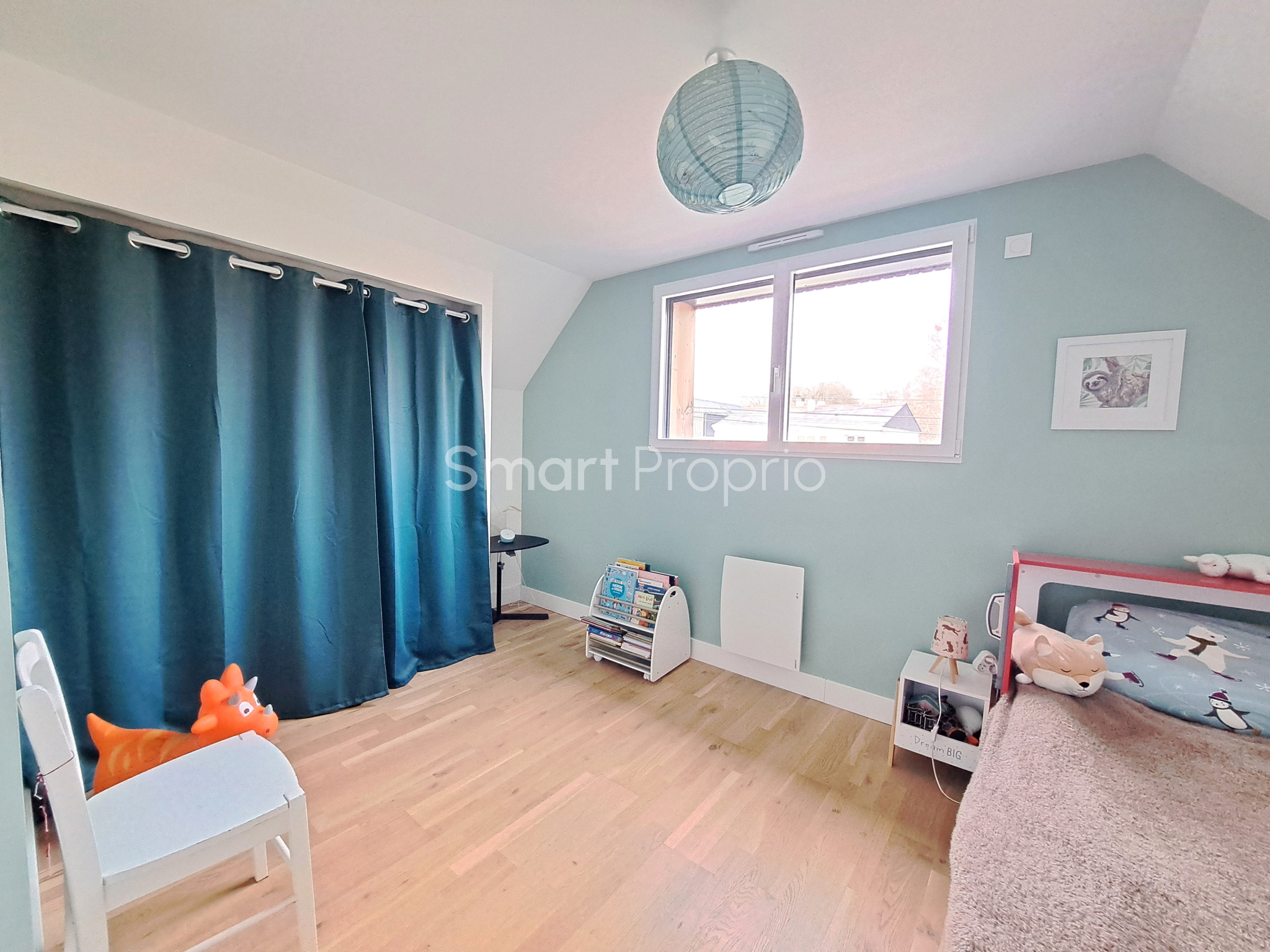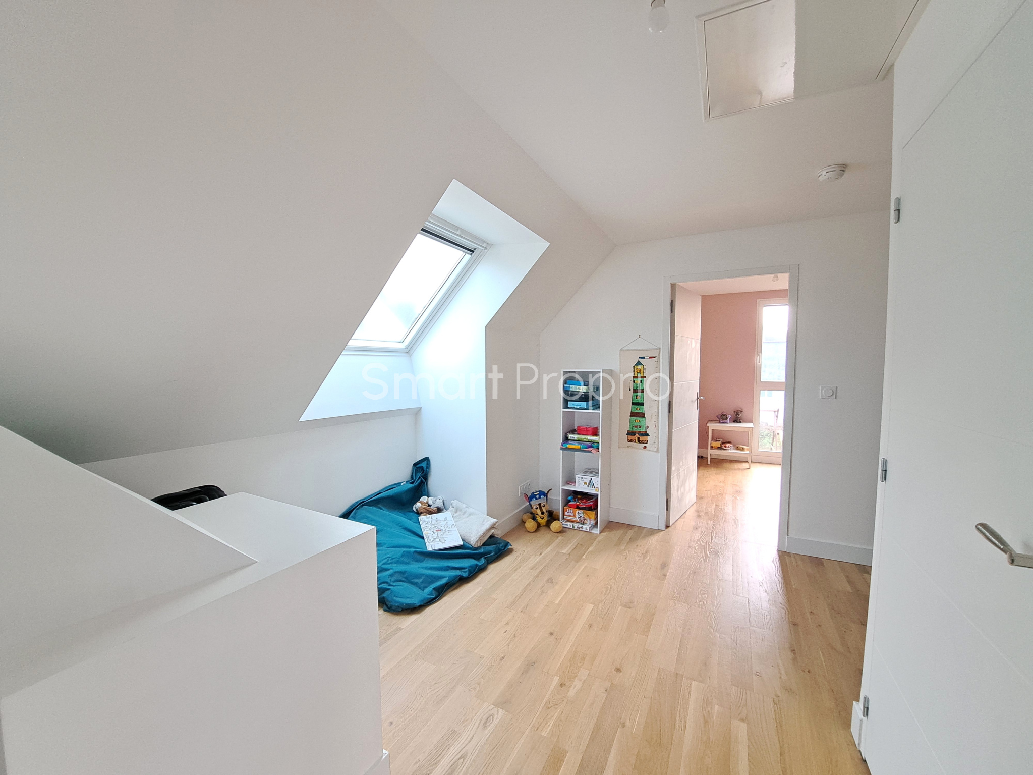 À l’étage, un dégagement de type mezzanine dessert deux belles chambres et une salle de bains avec WC, offrant un espace nuit fonctionnel et agréable pour la famille ou les invités.