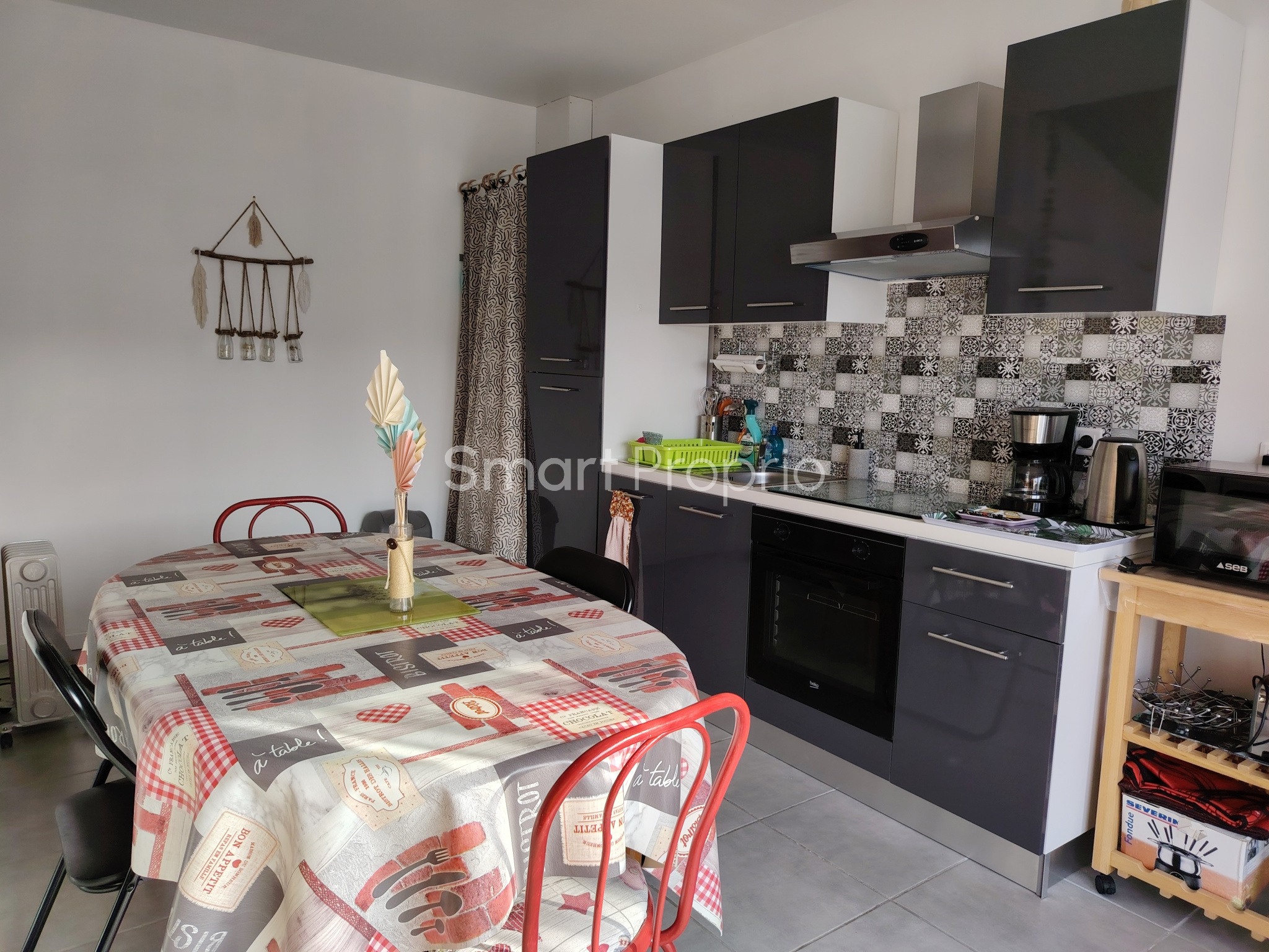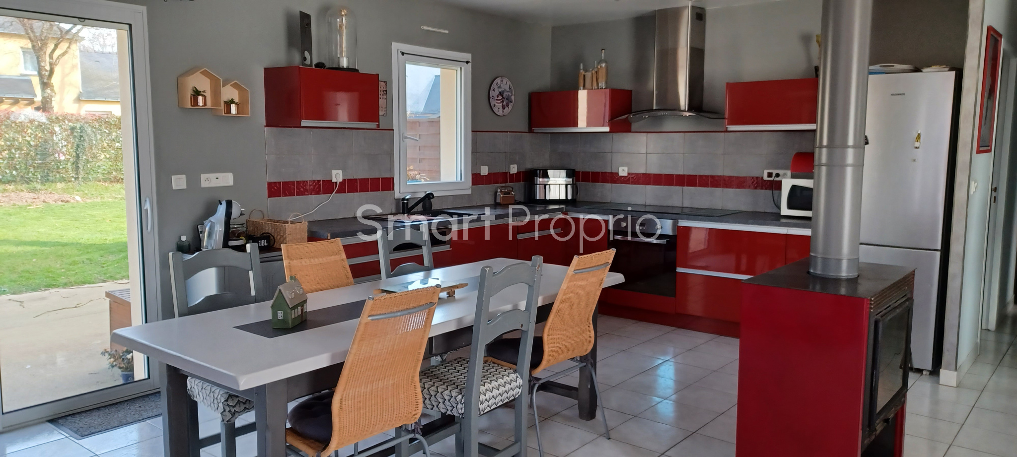 La cuisine ouverte aménagée et équipée avec coin repas crée un espace fluide et convivial, idéal pour partager les moments en famille ou entre amis.