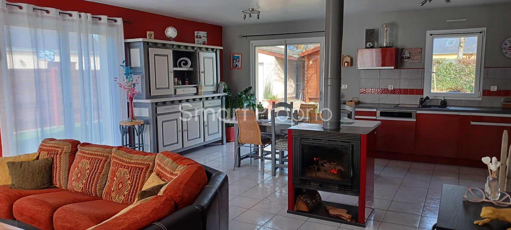 Dès l’entrée, vous découvrez une pièce de vie chaleureuse composée d’un salon avec poêle à bois, apportant confort et convivialité en toute saison.