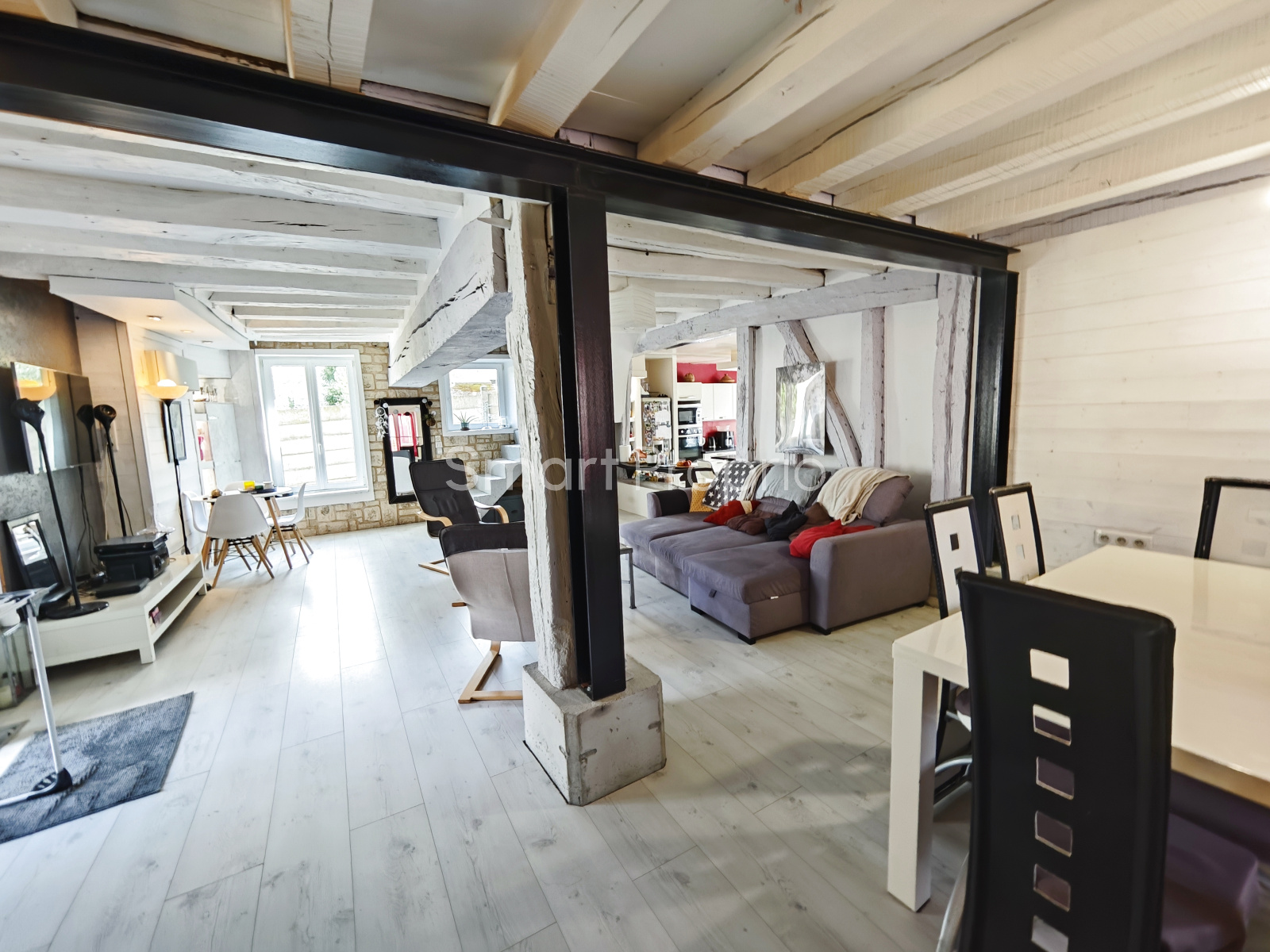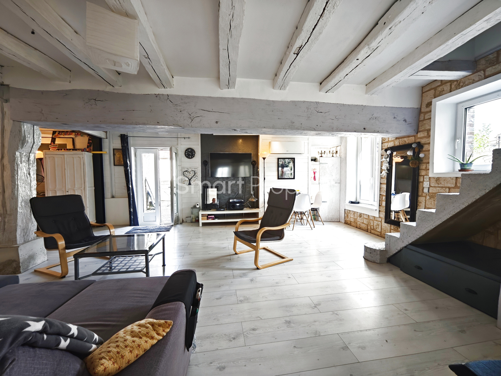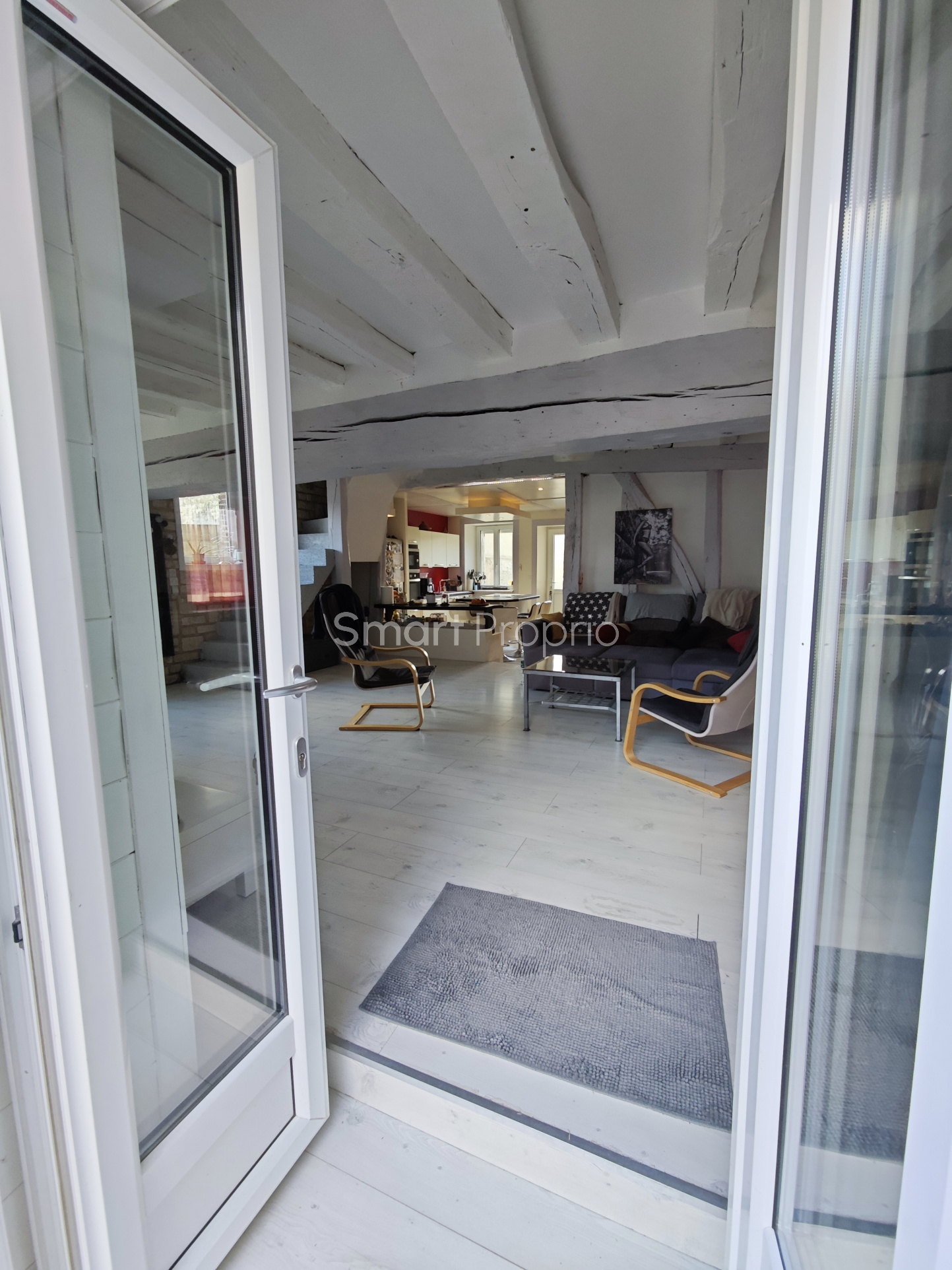 Dès l'entrée, vous découvrez une belle pièce de vie chaleureuse avec cuisine aménagée et équipée, suivi d'un espace salon / salle à manger, et de grandes ouvertures vitrées donnant un accès direct à la terrasse extérieure.