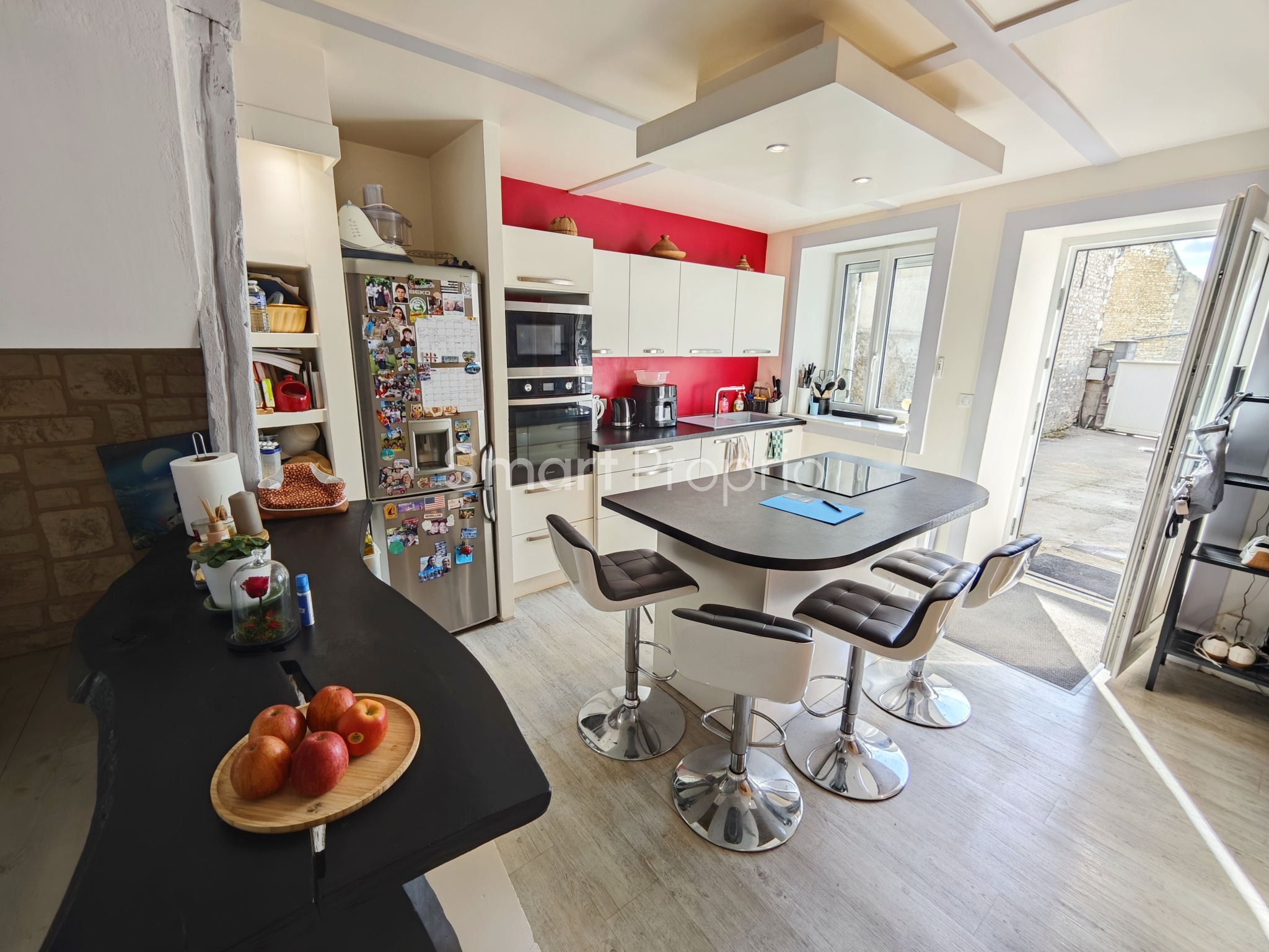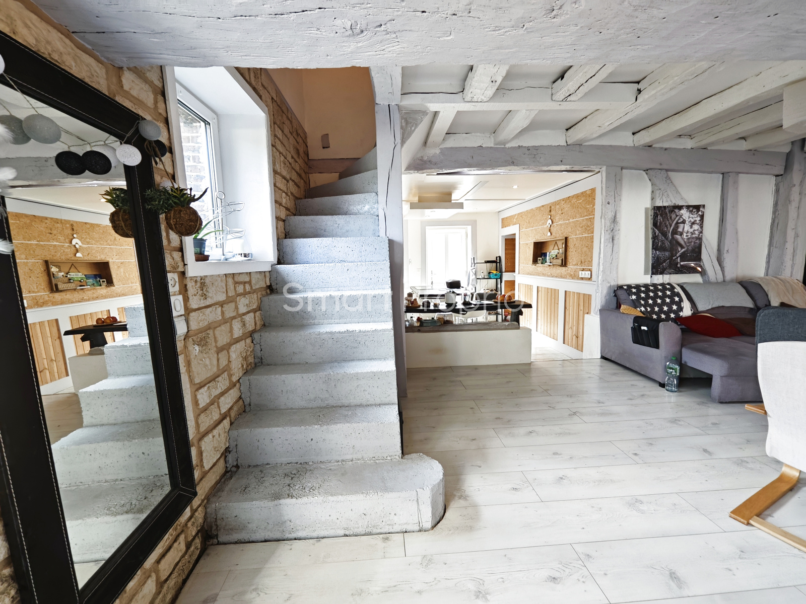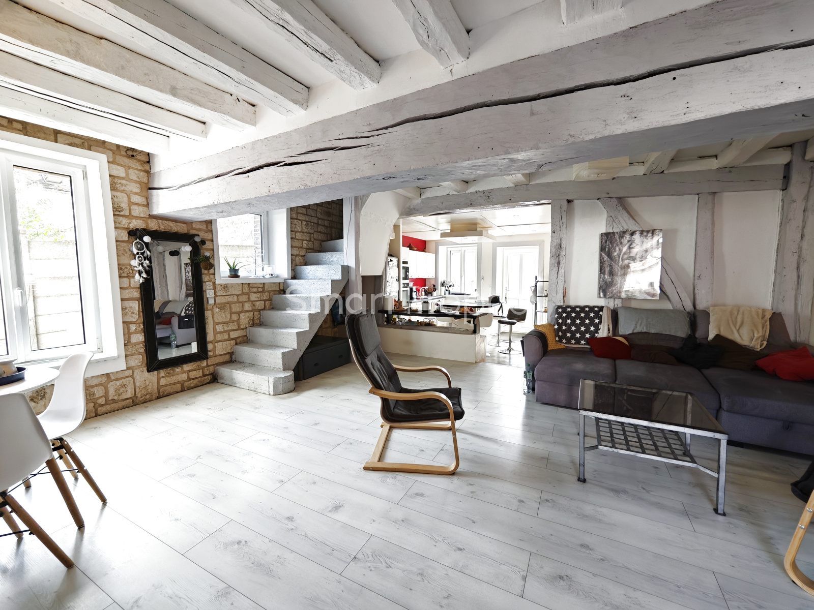 Dès l'entrée, vous découvrez une belle pièce de vie chaleureuse avec cuisine aménagée et équipée, suivi d'un espace salon / salle à manger, et de grandes ouvertures vitrées donnant un accès direct à la terrasse extérieure.